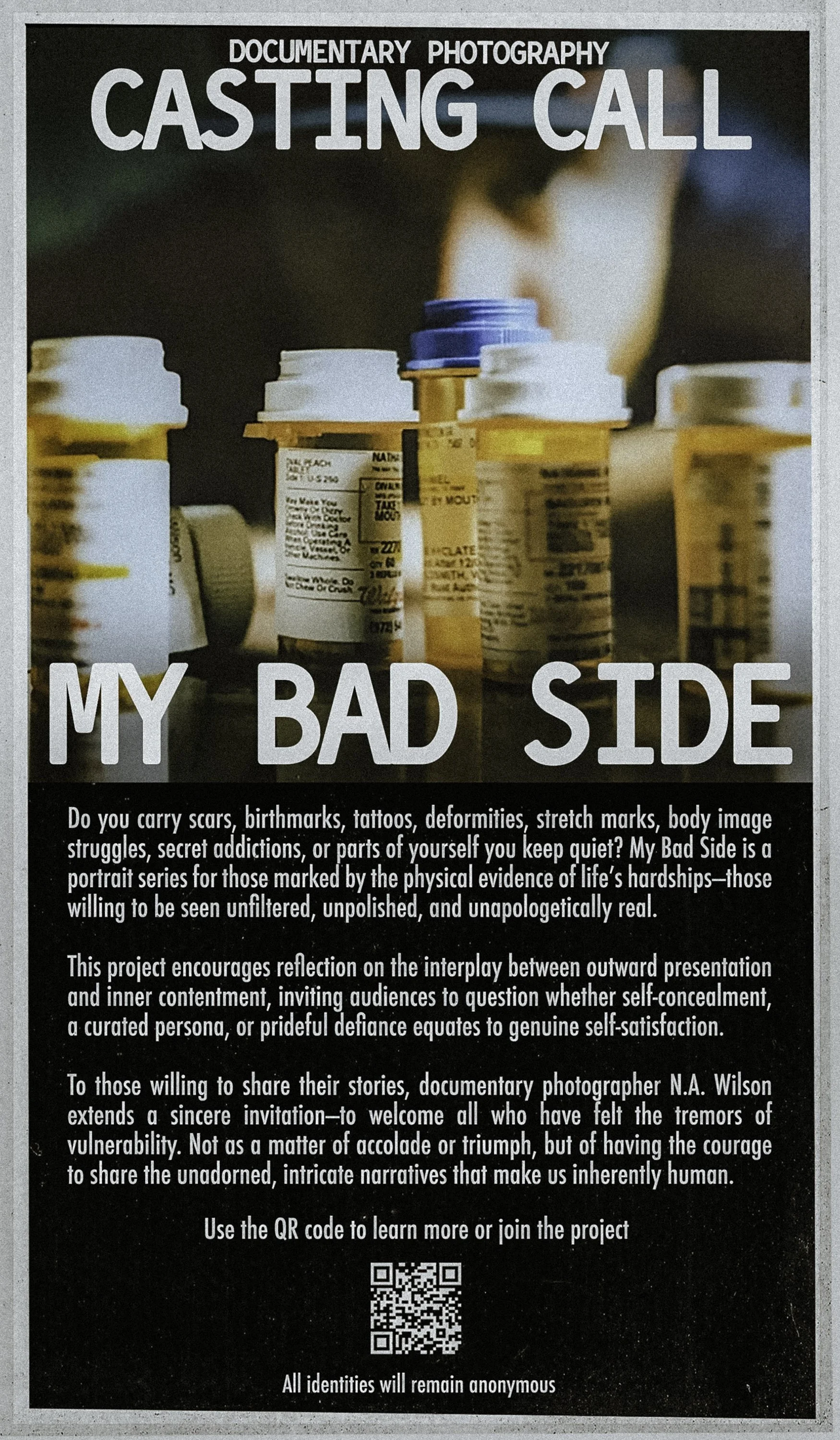 Do you carry scars, birthmarks, regretful tattoos, deformities, stretch marks, body image struggles, secret addictions, or parts of yourself you keep quiet? My Bad Side is a portrait series for those marked by the physical evidence of life’s hardships—those willing to be seen unfiltered, unpolished, and unapologetically real.